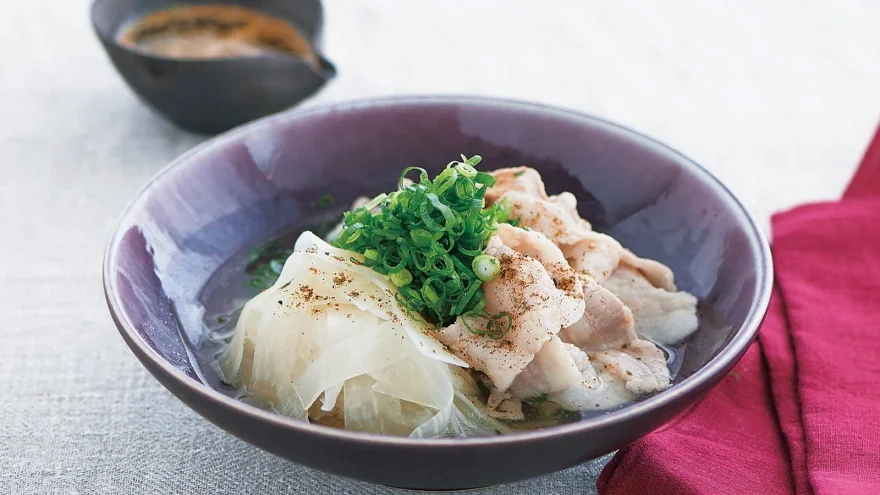 濃い味になりがちな煮物を塩なしで!だしと豚肉のうまみをきかせた、上品な味わいです。細ねぎと七味とうがらしの風味、たれの酸味を楽しんで。