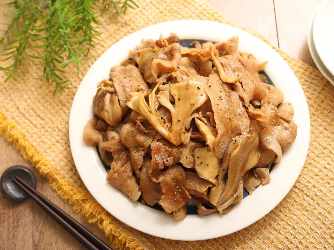 豚バラ肉とまいたけを「味ぽん」で炒め合わせ、粗挽き黒こしょうでアクセントをつけました。パパっと作れる時短な一品です。
