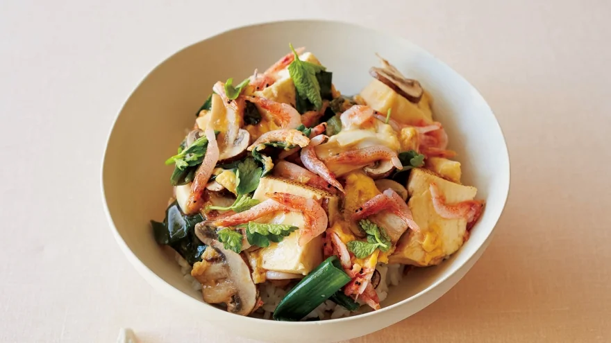 静岡県名産の桜えびは春が旬。生の桜えびをねぎや豆腐とともにすき焼き風に煮た、伝統的な漁師料理「沖あがり」を丼物にアレンジ。マッシュルームのうまみが隠れたポイントです。