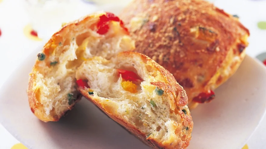カラフルで楽しいパンは「リュスティック」の生地に野菜、チーズ、ナッツをミックスしたもの。ワインのおつまみにも最適です。
