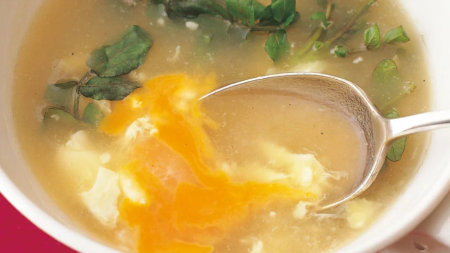たまねぎの甘みがたっぷりの白いスープに、まろやかに混ざり合う黄身が絶妙です。